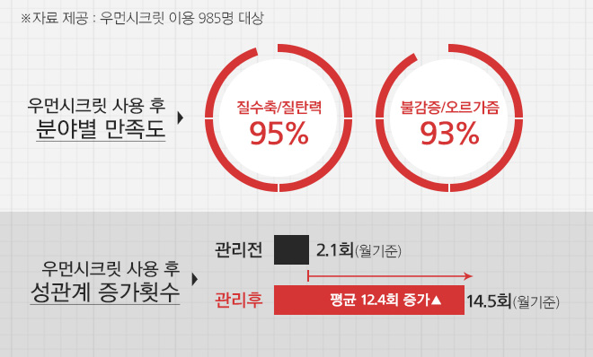 김수진씨의 말대로 실제 많은 4060대 여성들이 ‘우먼시크릿’에 만족했고, 성관계 횟수가 증가했다고 답했다. 오르가즘뿐만 아니라 '질수축, 질탄력', '요실금', '성교통, 질건조', '청결, 향사' 등의 다양한 문제를 우먼시크릿으로 통해 개선된 효과를 인증한 셈이다.